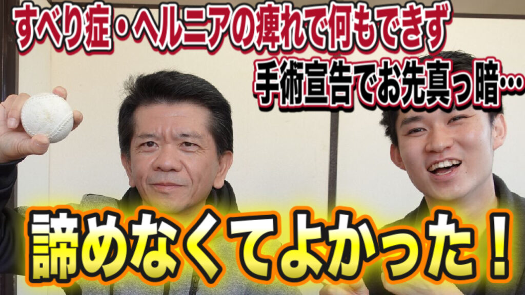【すべり症 ヘルニア】手術しかないと言われた「すべり症・ヘルニア」の痛み痺れが全く無くなりました!趣味の野球も出来て感動しました!